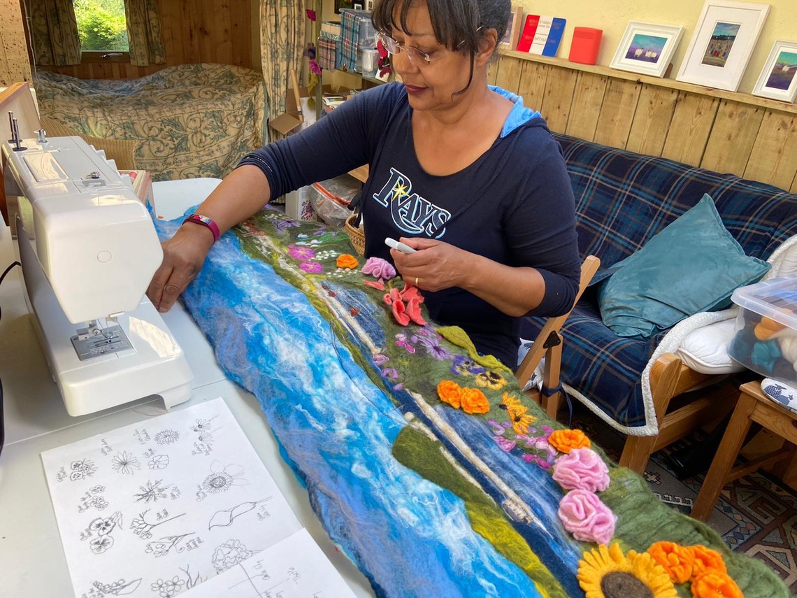 As a brilliant artist, Sue has been commissioned by Fun Palaces to create an artwork inspired by her neighbourhood. Sue and her neighbours collaborated to come up with a design for an artwork which would represent them, their street and their Fun Palace. Sue is creating a felted wallhanging depicting views which she and her neighbours can see from their street. As an inspired finishing touch, each neighbour on the Whatsapp Group has sent her a photo of their favourite flower or plant for Sue to incorporate into the wallhanging.