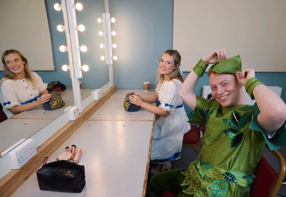 Peter Pan (Reece Duncan) and Wendy (Lorenza Michelucci-Dunn) get into costume and character.