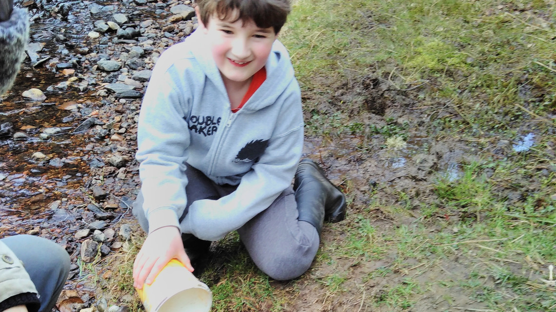 We succeeded in carrying the tub and the jar of spawn along the track to the garden without any of the slithery spawn spilling out. It was time to introduce the frogspawn to their new environment, our wee garden pond, and hope that they would be happy there, as they continue (we trust!) through their cycle to tadpoles to frogs. Ossian enjoyed releasing the frogspawn from the containers into our pond. He also 'saved’ two bugs who’d got stuck in the water…