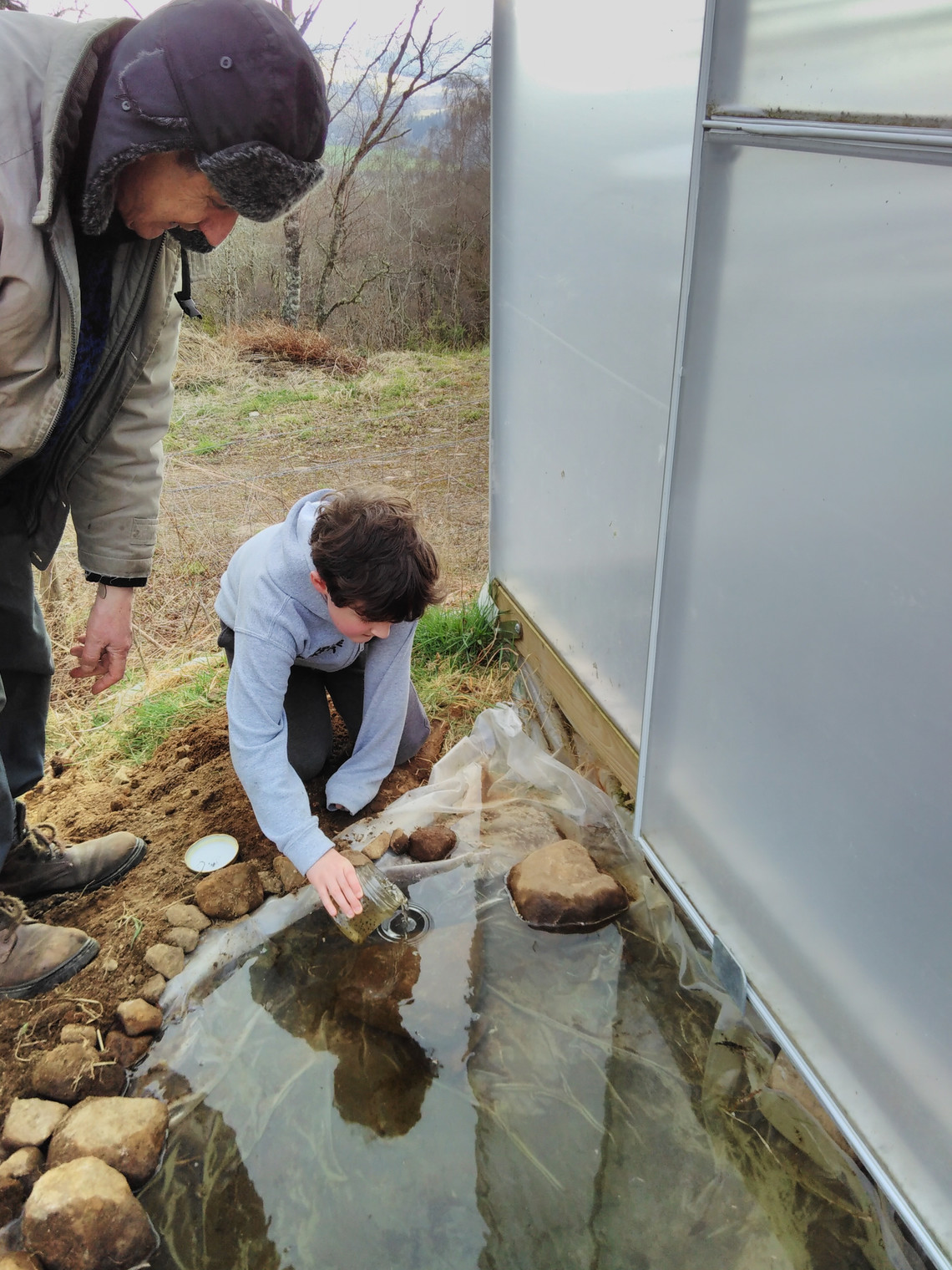 With it being warm and sunny up here in the Highlands my husband, Chris, our 10-year-old, Ossian, and I felt inspired to go out collecting frogspawn for our new garden pond.