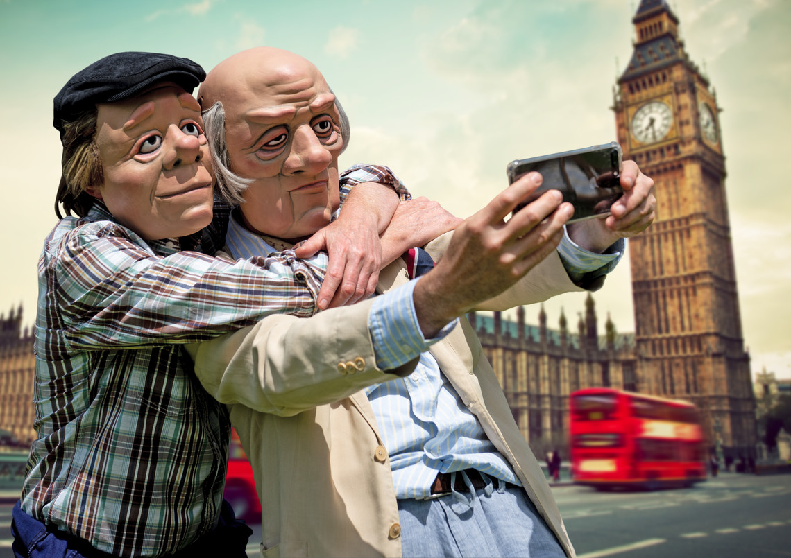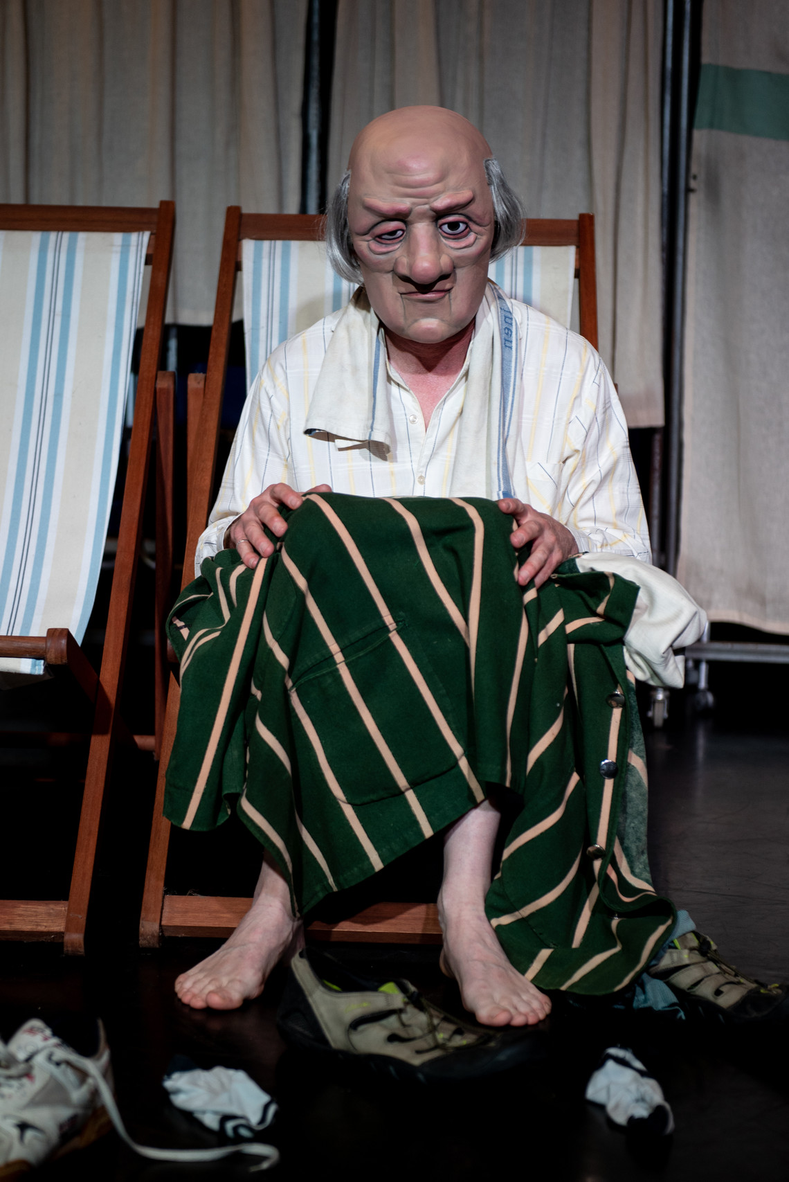 “The two men have an age gap between them and you really do need to accentuate that. With masks you are playing on stereotypes because that is the way our perception works. So if it’s an older guy you have to put them into an older person stereotype with grey hair and bags under their eyes.